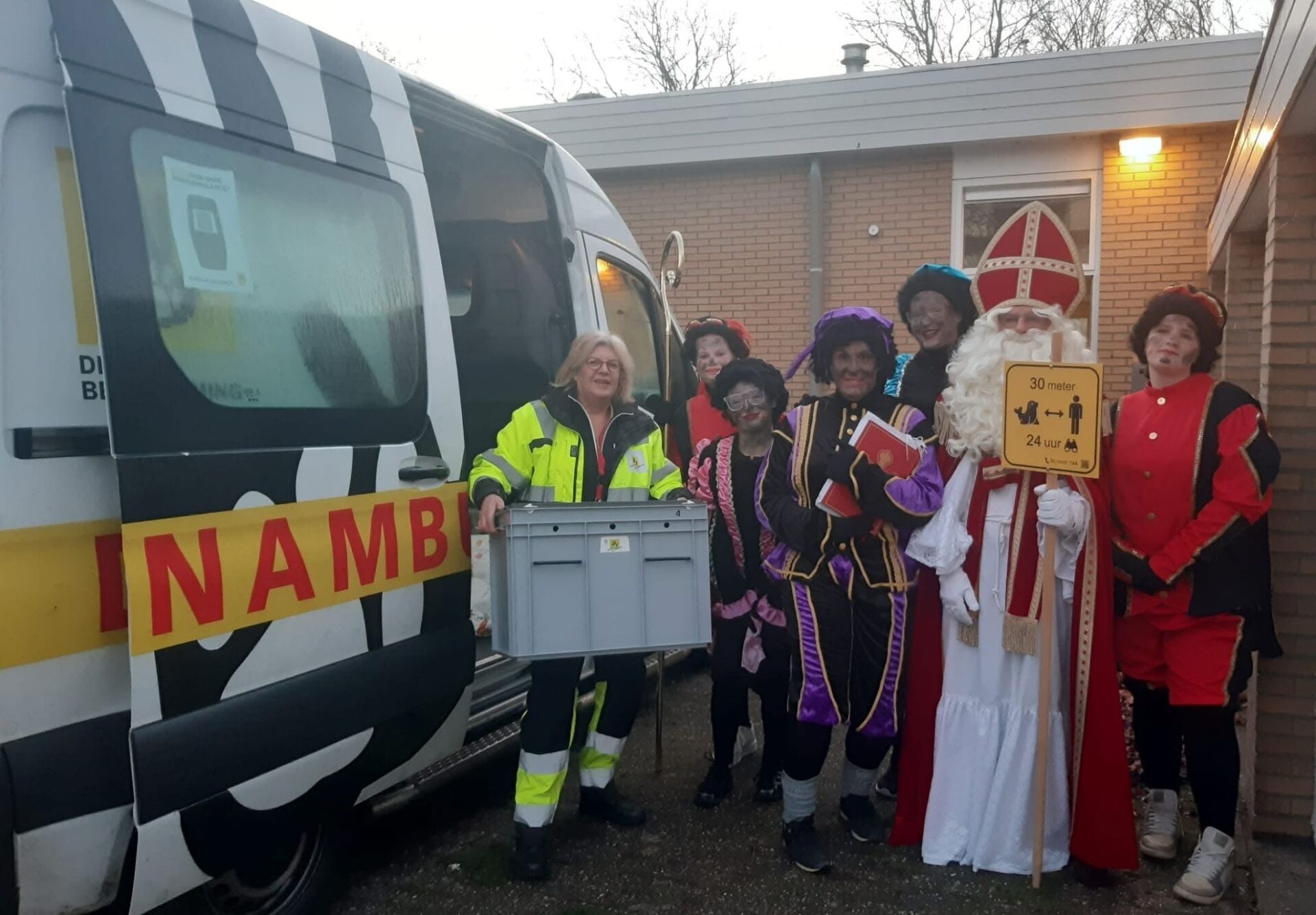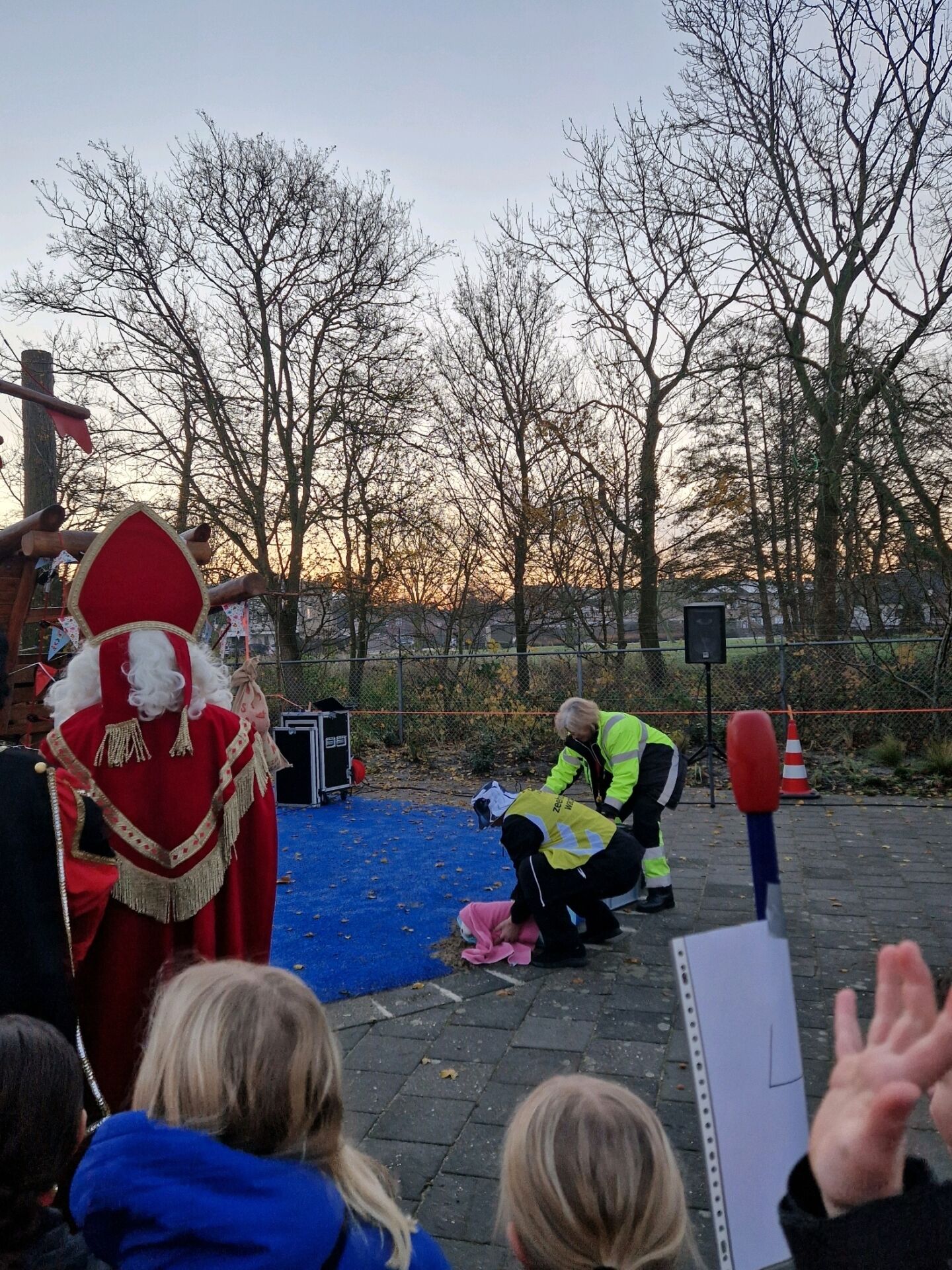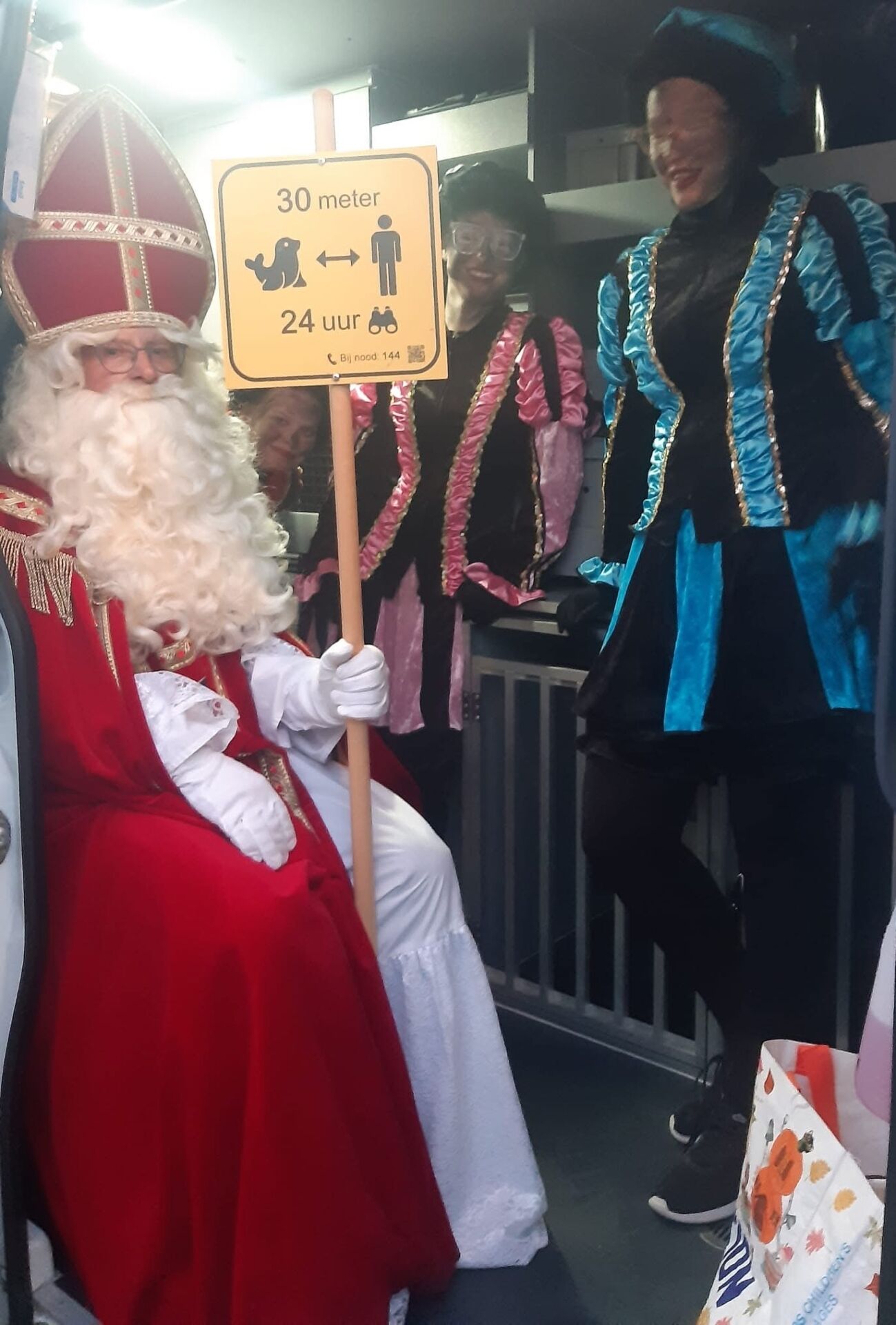 Sinterklaas hield een waarschuwingsbord omhoog en de pieten spanden afzetlinten zodat de zeehondenwachter aan het werk kon. Deze zag dat het dier gelukkig niks mankeerde, maar stopte het zeehondje voor de zekerheid in een speciale kist zodat het naar A-Seal vervoerd kon worden.
